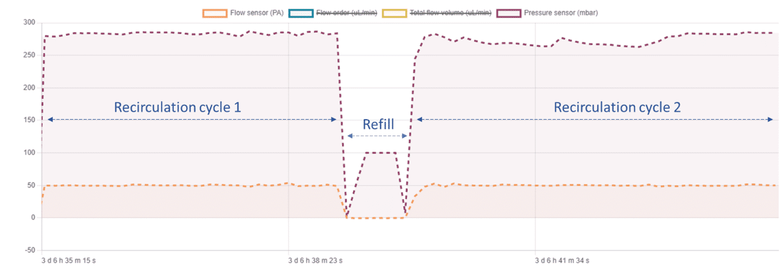 Figure 3 shows 2 recirculation cycles at a very stable flow rate (50 µL/min) in orange and an autoregulated pressure rate in purple. Between these 2 cycles, there is a refill step during which the flow rate drops to 0 to allow the fluid to pass from one reservoir to the other.