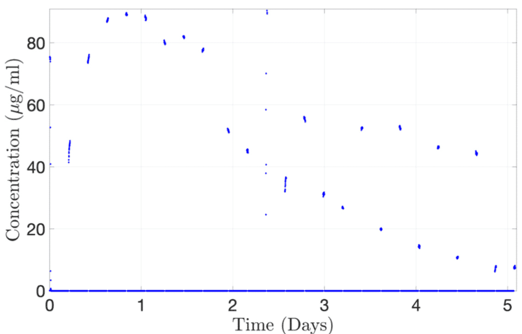 The integration of the 2-SWITCH/M-SWITCH setup facilitated continuous drug quantification across multiple model post-clearance from the PK-Eye™ model, utilizing a connected concentration probe through the M-SWITCH. The platform effectively selected different fluid outlets automatically from this combination of M-SWITCH and 2-SWITCH, enabling real-time monitoring of drug release between multiple flow outlets (figure 9).