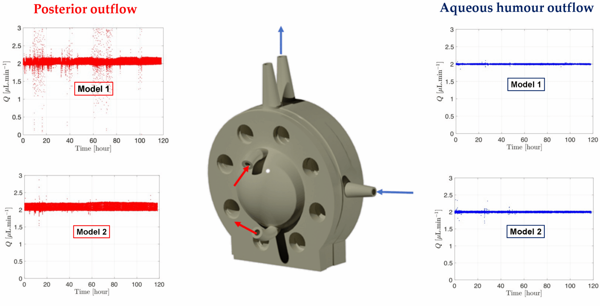 In parallel systems, pressure remained constant, allowing multiple models to be controlled simultaneously from a single pressure source with the ability to run up to six models concurrently. Ratio experiments demonstrated this, with each model flowing within a natural aqueous humor flow rate range (between 1.5 µL/min and 2.7 µL/min), highlighting the uniformity of the setup (figure 7).