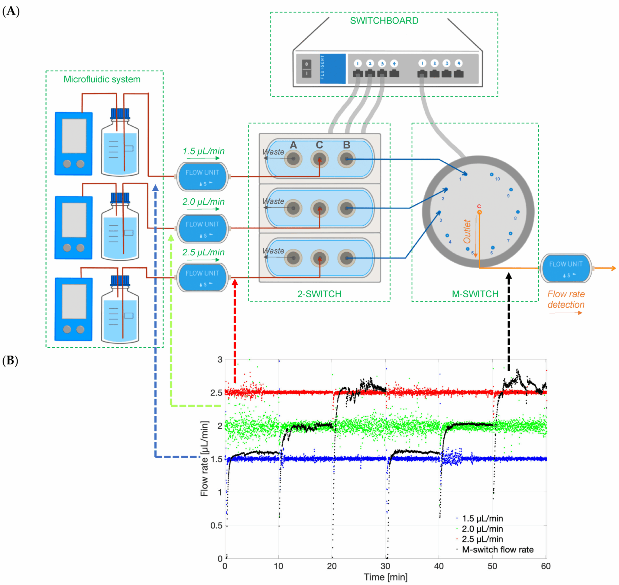 To enable real-time monitoring of drug release profiles across multiple models or fluid inlets, microfluidic valves from Fluigent were integrated into the system. It included three 3-port/2-way microfluidic valves (2-SWITCH), an 11-port/10-position rotary valve (M-SWITCH), and a SWITCHBOARD (Previous version of SWITCH EZ) (figure 6). This platform facilitated the selective collection of outflows from different models or inlets into the concentration detector, allowing for varied release profile readouts.