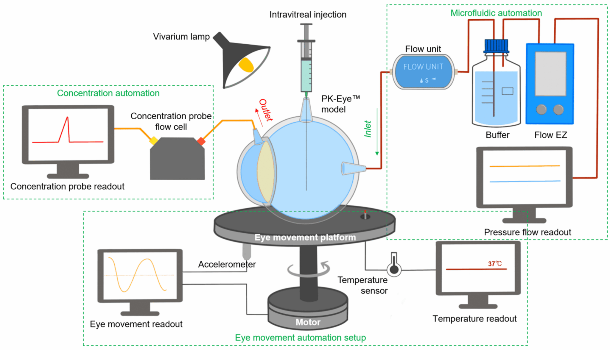 Key features of the platform included monitoring flow, temperature, eye movements, and concentration evaluation of labeled protein molecules (figure 4).