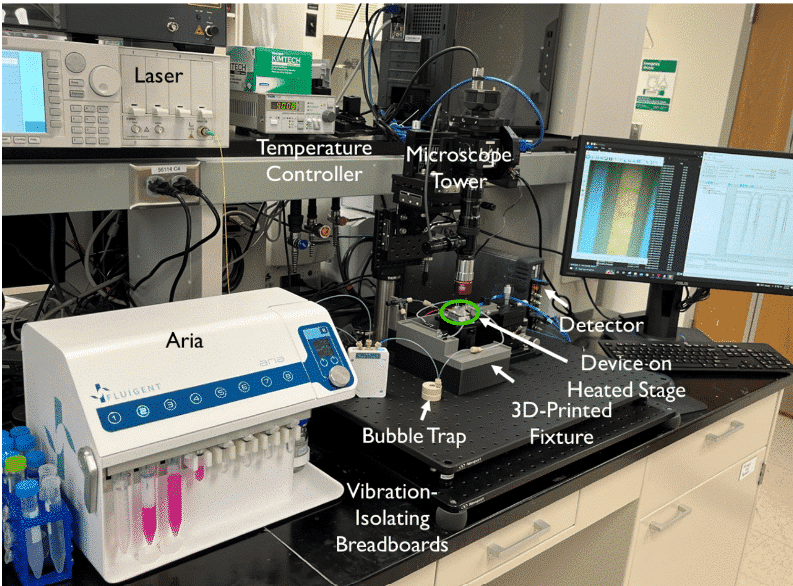 - Optical configuration: An optical set-up is also used to capture the resonance shifts transmitted by the sensors in real time. This includes a tunable laser source, a fiber array aligned to the chip, and visible IR cameras.