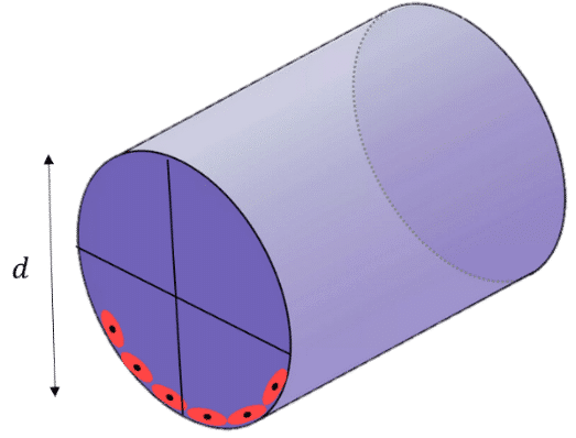 Where Q is the flow rate and r is the radial distance from the centerline of the channel (see figure). The distribution of flow velocities follows a parabolic profile, and the maximum velocity is for r = 0, at the center of the channel. It is of interest to determine the shear stress distribution at the channel wall (r = d/2), as this is where cells are located in the chip. To do so, the strain rate should be calculated by differentiating the flow velocity with respect to r. We get: