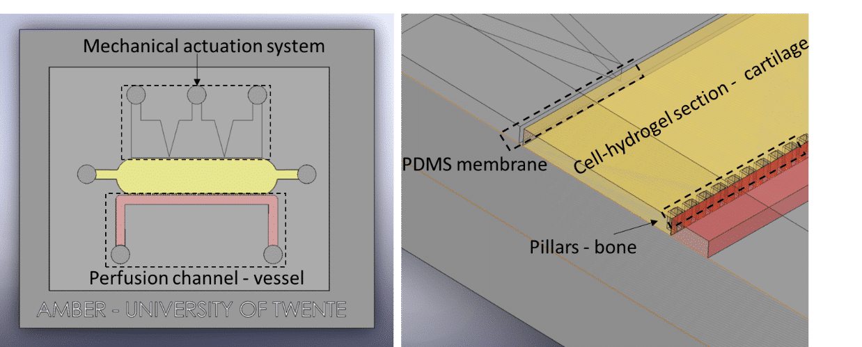 Fluigent presented a cartilage on a chip model (see figure) to elucidating how chondrocytes react to mechanical stimuli, allowing to understand processes triggering cartilage diseases like osteoarthritis11. This organ on a chip platform (consisting of a mechanical stimulation unit, a PDMS membrane, a 3D cell culture chamber, and a perfusion channel) allowed performing mechanical stimulation on cells, while creating dynamic culture conditions. More information can be found on the application note webpage.